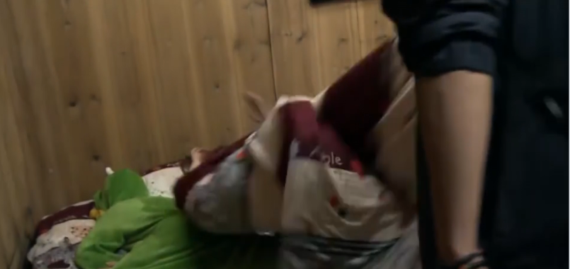 突然被陌生闯入的男人掀被子,杨紫吓得抱着熊缩成一团,贴在墙角。