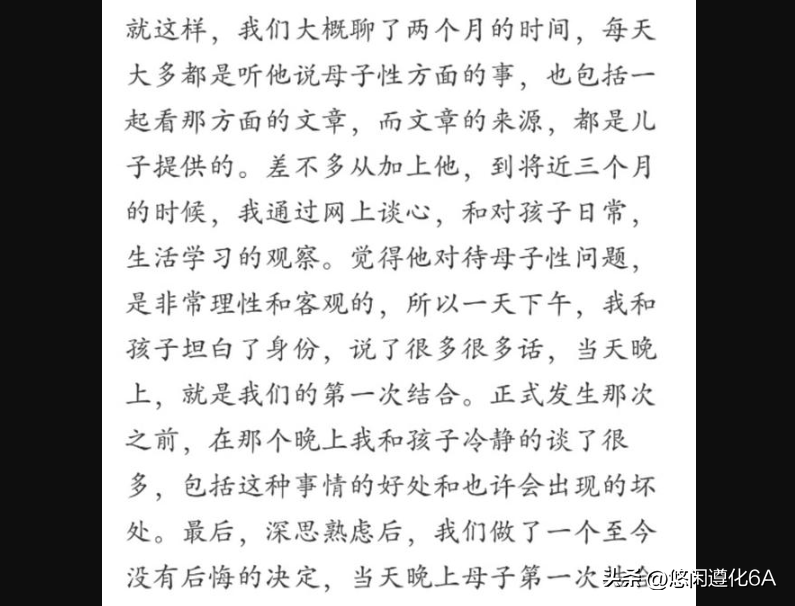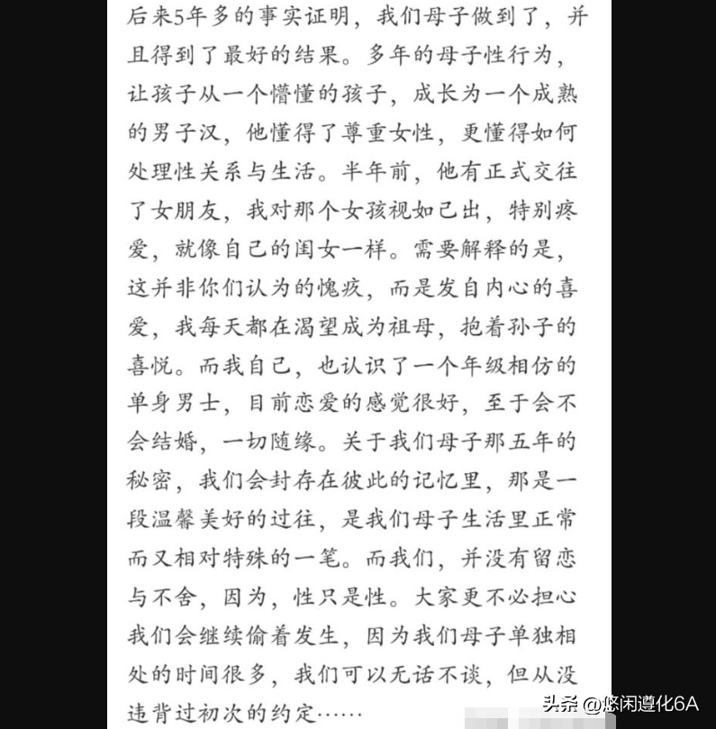 后续还有人爆料出,儿子与女朋友分手后,儿子向女朋友坦白了自己与母亲长达五年的混乱关系。