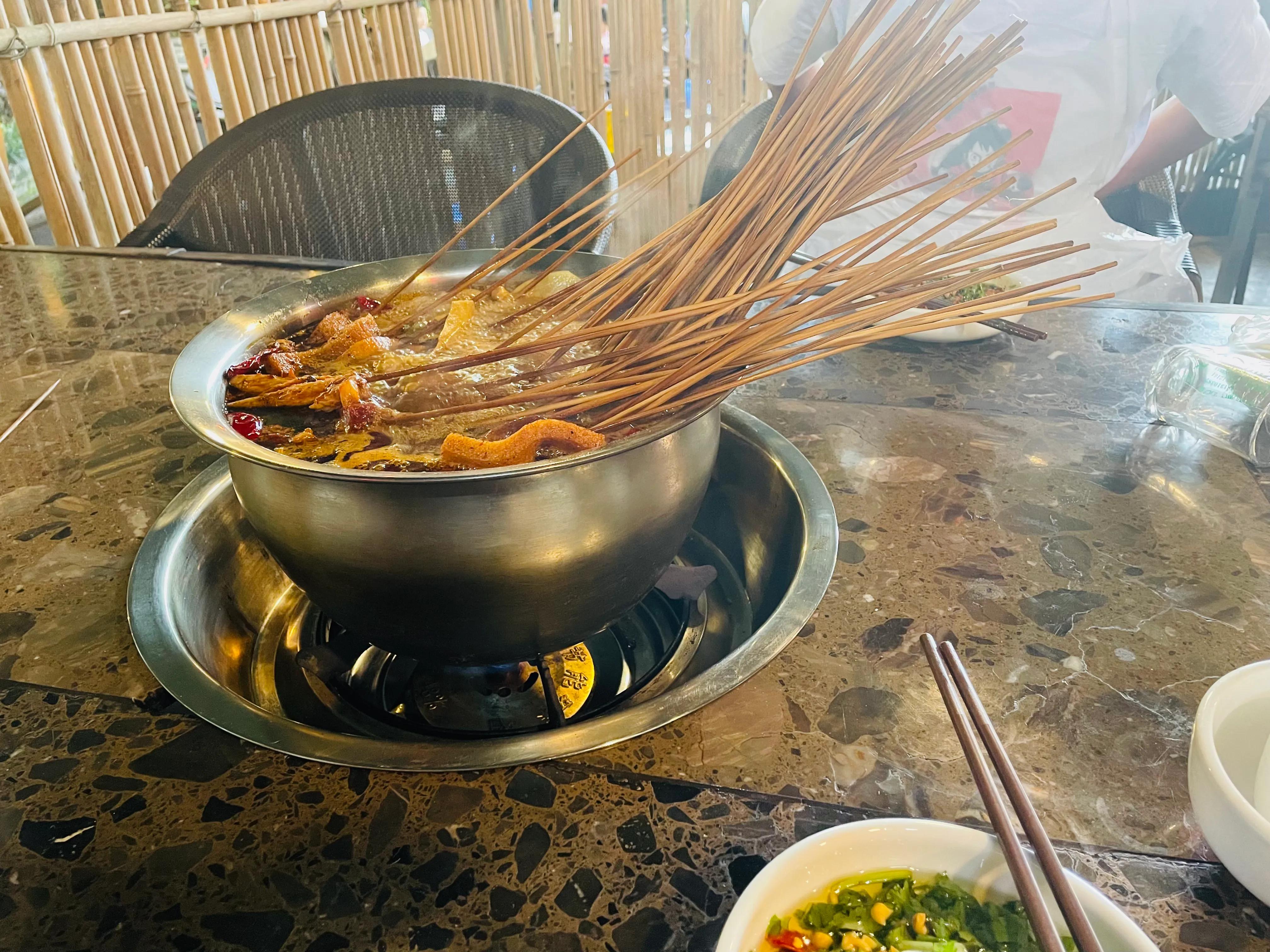 味道不同于成都使用大量牛油的浓烈,但也有一番小清新,环境是真的好,仿佛是在野餐。