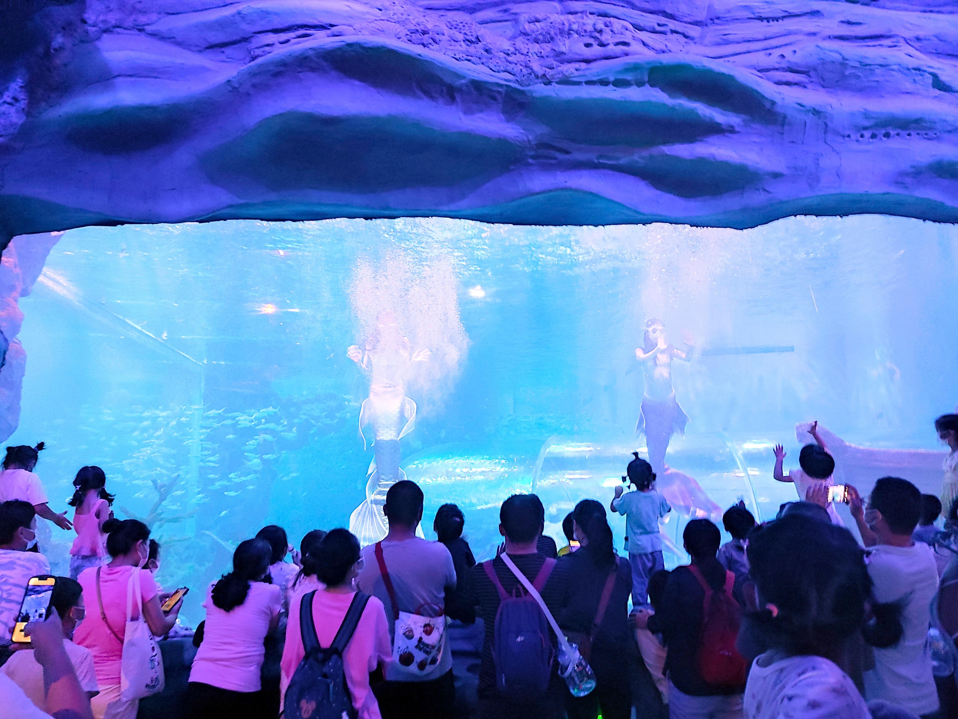 美人鱼表演同样精彩,与观众有很多互动,两条美人鱼曼妙的舞动着身姿,吸引着周边的鱼群以及观众的目光。